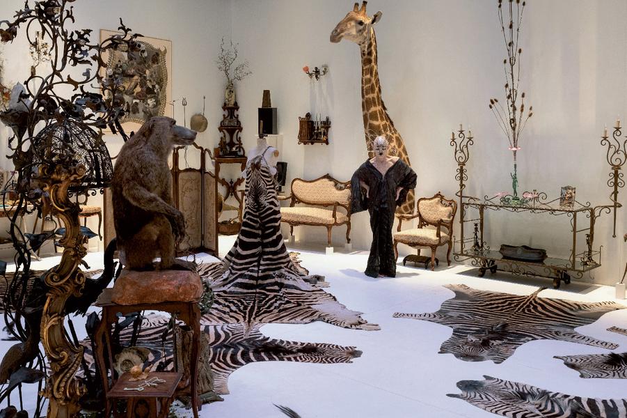 Des tableaux, des candélabres, des guéridons ou encore des animaux naturalisés : Steven Cohen nous ouvre son boudoir – une pièce à l’origine réservée aux femmes pour de multiples usages, lieu d’étude, de politique, de science, de pratique des arts, de rencontres, de complots… – à l’écart de la sphère civile des hommes. Tout aussi baroque que son intérieur, le performeur sud-africain, perché sur des talons interminables en forme de globes et flanqué d’ailes de papillon, nous guide dans les secrets de son cocon, visuel, lumineux, olfactif. Entre un mobilier hérité de l’époque coloniale et une étoile jaune, les bruits de l’extérieur nous parviennent par images projetées : un atelier de tannerie en Afrique du Sud ou un camp de concentration alsacien. Pour l’artiste au corps ornementé, métamorphosé et exposé, le privé est une affaire publique, et l’intime la matrice de nos possibles actions politiques. Du haut de sa silhouette fragile et sublimée, il nous aide à trouver un équilibre, même précaire, dans ce qui fait « l’humanité » et ses extrêmes paradoxes.