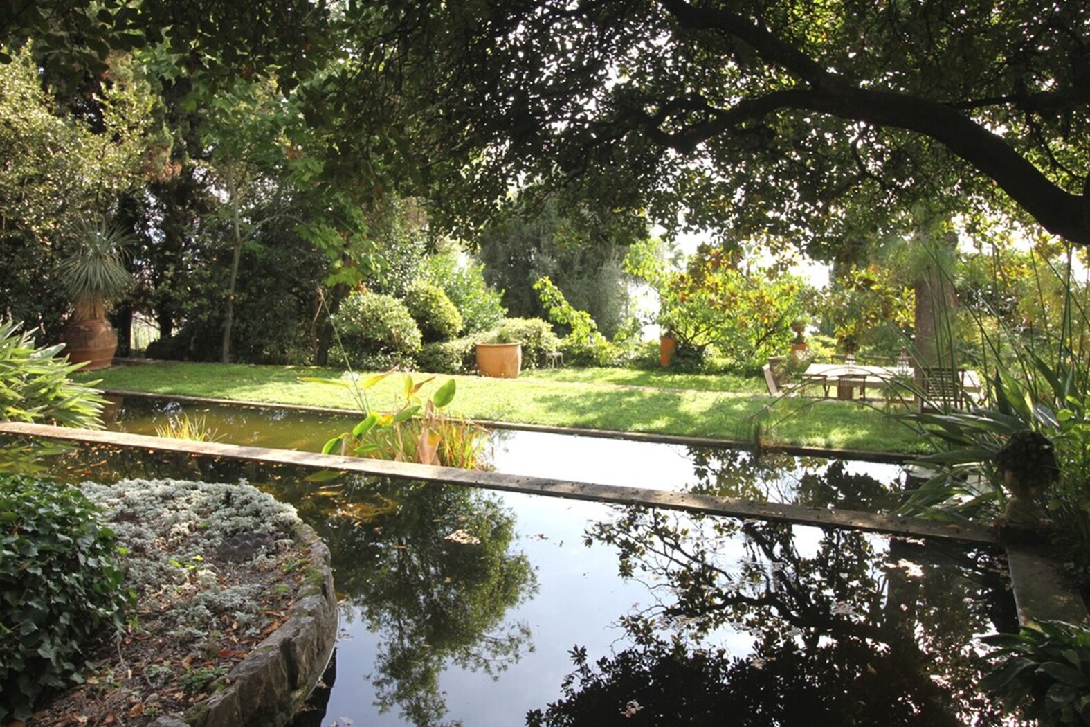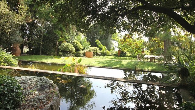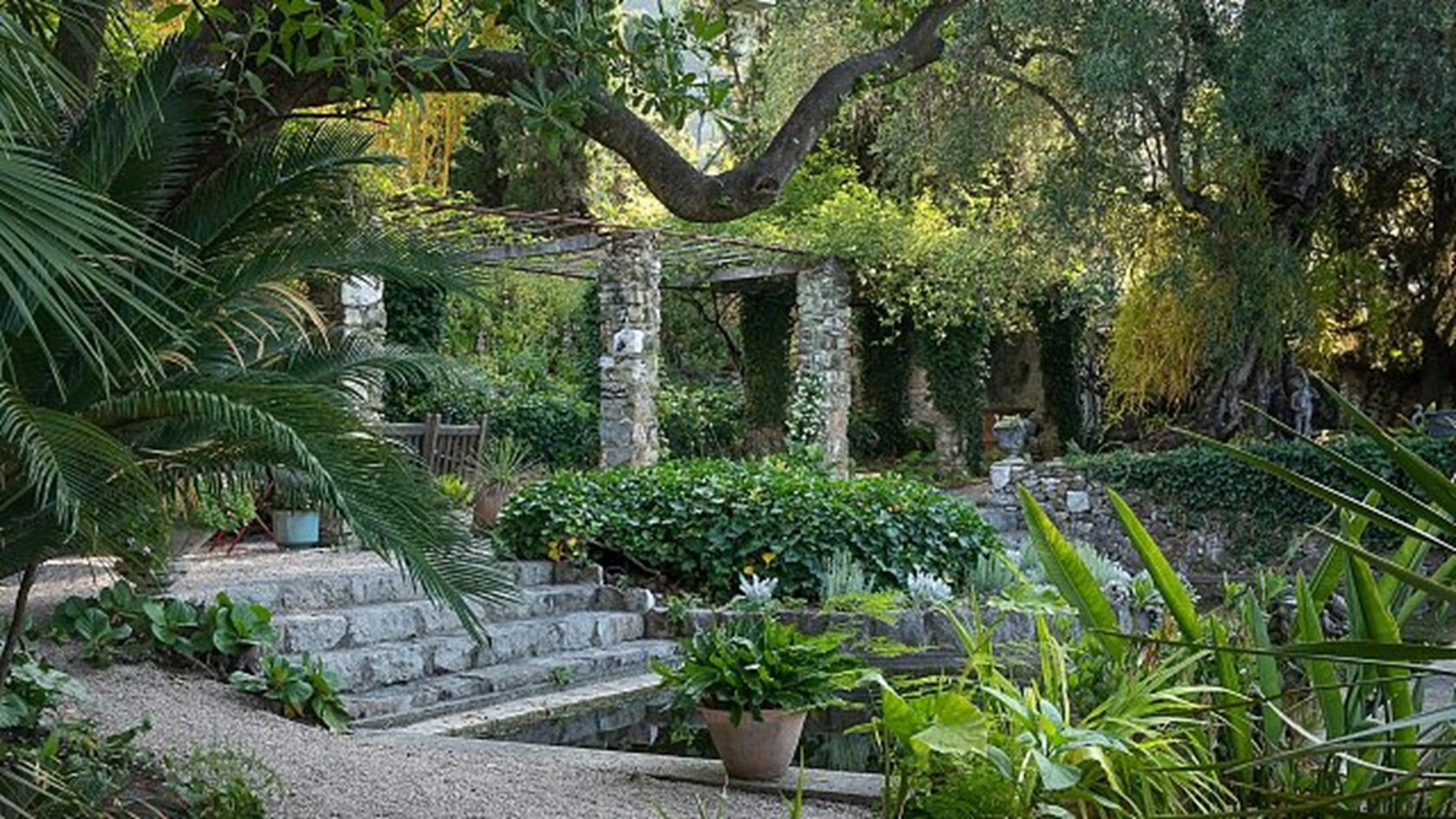 Son agencement en terrasses, typique des jardins méditerranéens, permet de profiter d’une grande diversité botanique, où palmiers, cycas, glycines et plantes exotiques cohabitent dans une luxuriance envoûtante. Un élégant bassin central, entouré d’une végétation dense, apporte une touche de sérénité et reflète les couleurs chatoyantes du jardin.