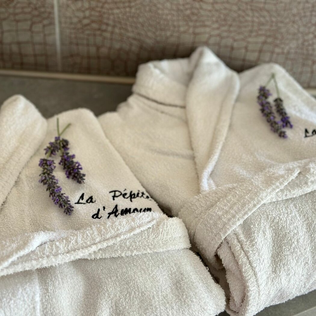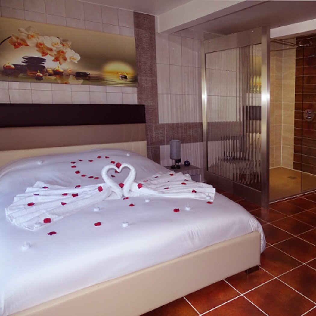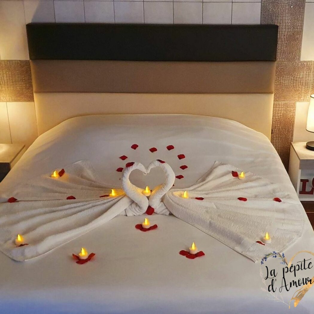 Puis retrouvez votre nid d’amour : une chambre de charme pensée pour les amoureux, avec son petit salon intimiste, sa douche aux lumières changeantes et son lit délicatement décoré pour vous promettre une nuit exquise à deux.