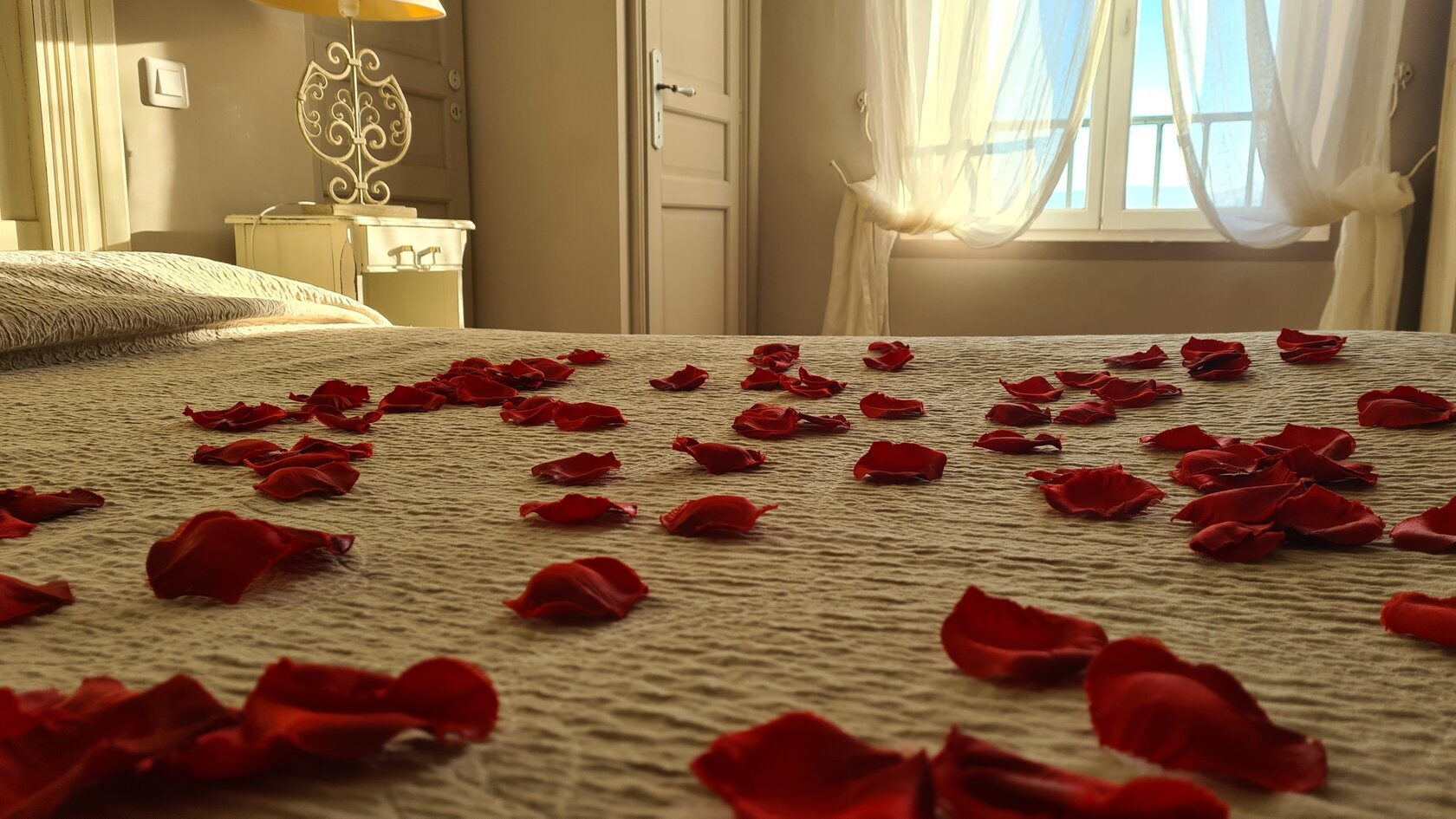 Bénéficiez d'un accueil personnalisé avec une ambiance romantique dans votre chambre : pétales de roses, 1/2 bouteille de Champagne en chambre.